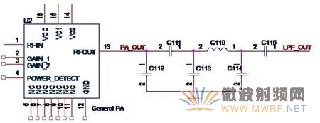 濾波器的設(shè)計(jì)需要很復(fù)雜的計(jì)算,在這里我不想探討過多的理論知識(shí),所以,我就不給出如何計(jì)算的方法,只給出一般的低通濾波器的形式。這里需要指出的是,Atheros的設(shè)計(jì)一般會(huì)使用三個(gè)元件,而Ralink一般會(huì)使用五個(gè)元件。如圖3-7所示,是Ralink常用的濾波器形式。在圖中,C112,C111,C113,C110和C114就組成了一個(gè)低通濾波器,來自功放芯片的信號(hào)PA_OUT經(jīng)過濾波器后得到LPF_OUT這信號(hào)送至后續(xù)電路。