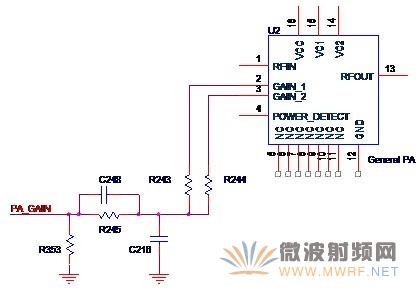 增益控制的作用就是可以改變功放電路的增益,從而能改變輸出功率。改變功率放大器最終輸出功率的方法有兩種,一種是無線收發(fā)器改變自身的輸出功率,另外一種就是改變功放電路的增益,在這里我們主要關(guān)注后者。通常功放芯片的增益控制管腳會(huì)有兩個(gè)或者兩個(gè)以上,分別改變的是第一級(jí)放大和第二級(jí)放大的增益值,圖3-11是典型的增益控制原理圖。來自收發(fā)器的控制信號(hào)PA_GAIN經(jīng)過R245和C248組成的RC濾波電路(濾除來自收發(fā)器的可能的交流成分)通過兩個(gè)電阻作用于功放芯片的GAIN_1和GAIN_2兩個(gè)管腳,從而控制功率放大電路的增益,也控制著最終的輸出功率。