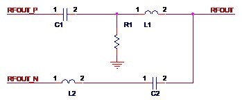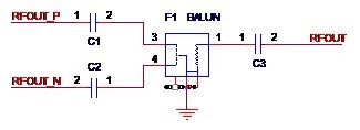 方法一,使用平衡器。原本相位相差180°的差分信號(hào)經(jīng)過平衡器(Balun,俗稱巴倫),就可以得到合二為一的單端射頻信號(hào)。如圖2-5所示,圖中的F1就是一個(gè)平衡器,差分信號(hào)RFOUT_P和RFOUT_N經(jīng)過F1得到單端信號(hào)RF_OUT。