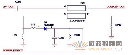 我們?cè)谶@里用單獨(dú)的一節(jié)來討論外圍的檢測(cè)電路,其實(shí)要講的就是Atheros的方案,因?yàn)檫@個(gè)設(shè)計(jì)實(shí)在是太有個(gè)性了,讓我們來一起見識(shí)一下吧。如圖3-10所示,就是Atheros常用的功率檢測(cè)方案。圖中的PC1就是一個(gè)印制耦合器(Printed Coupler),來自功率放大器的輸出信號(hào)LPF_OUT經(jīng)過耦合器,就在2,3腳感應(yīng)到高頻交變電壓,這個(gè)電壓隨著輸出功率的增大而增大L18,L19,D1,C217,R248組成了常規(guī)的整流電路,這樣,就得到了隨著輸出功率的變化而變化的直流電壓POWER_DETECT,無線收發(fā)器就可以得到這個(gè)電壓值從而做作出相應(yīng)的動(dòng)作。