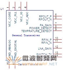 收發(fā)器通常會(huì)有很多的管腳,在如圖2-1中,我只給出了射頻電路設(shè)計(jì)時(shí)會(huì)關(guān)注的管腳,可以看到,有幾個(gè)電源管腳,數(shù)字地,模擬地,射頻輸出,功率放大器增益控制,功率檢測(cè),溫度檢測(cè),射頻輸入,低噪聲放大器增益控制,發(fā)射、接收切換等管腳,在接下來的內(nèi)容中,我會(huì)把這些管腳分模塊逐個(gè)講解。