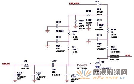 圖中的LNA_GAIN是來自無線收發(fā)器(Radio Transceiver)的增益控制信號(hào),放大器使用的晶體管就是最常用的SGA-8343,R238,R239,R240是基極的偏置電阻,C219,L20,C220組成了低通濾波器,來自切換芯片(Switch)的LNA_IN通過低通濾波器之后經(jīng)由C218耦合至低噪聲放大器,Q2與C221,L51,C214,R240,C210,R239,R238,C211,R241,C215,L52組成了共射極放大電路,最終輸出RFIN送至收發(fā)器進(jìn)行處理。